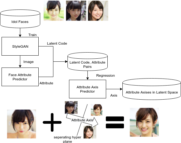 StyleGAN是由许多偶像脸部图像训练而成,数量超过15K的图像。StyleGAN和其他GAN一样有一个潜伏空间。在系统中,StyleGAN在潜伏空间中使用随机抽样的方式生成150K张图像,并通过人脸属性预测器对图像进行分类,制作一个数据集,从潜伏码中预测属性。然后,属性轴预测器从潜码中学习预测属性并预测轴。在最新的空间里往这个方向添加属性的结果