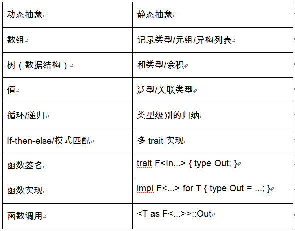 当然,这比外部的 M4 要好,但不管怎样,它也是上个世纪的方法;过程式宏甚至无法处理抽象语法书,因为用于编写过程式宏的一个常用结构 syn::Item 的本质是具体语法树(concrete syntax tree),或者叫“解析树”。相反,类型是宿主语言的重要组成部分,因此,如果我们能用类型来表达程序化的抽象,就会重用语言抽象,而不是依赖于一次性的机制。