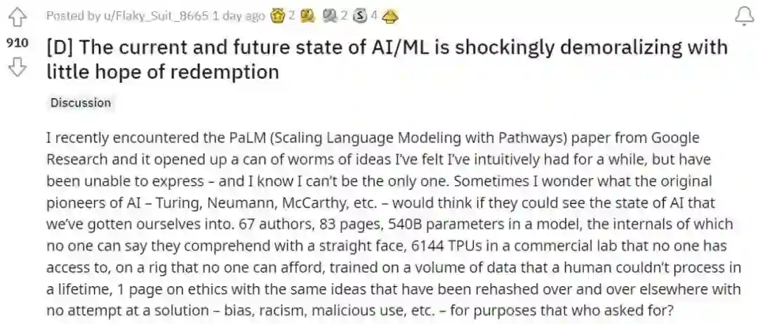 「我觉得 AI / 机器学习前途的令人震惊的黯淡,几乎没有救赎的希望」一位 AI 从业者最近在 Reddit 的机器学习板块发了一个帖子。
