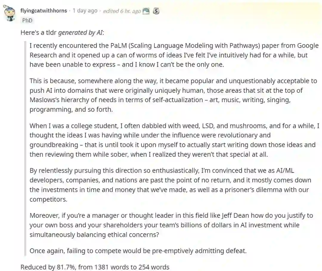 对于人工智能抹杀人类创造能力的担忧或许有其道理。不过现代社会,说的太多就意味着没人愿意看,于是热心网友用 AI 的文本总结功能对这段话进行了摘要。
