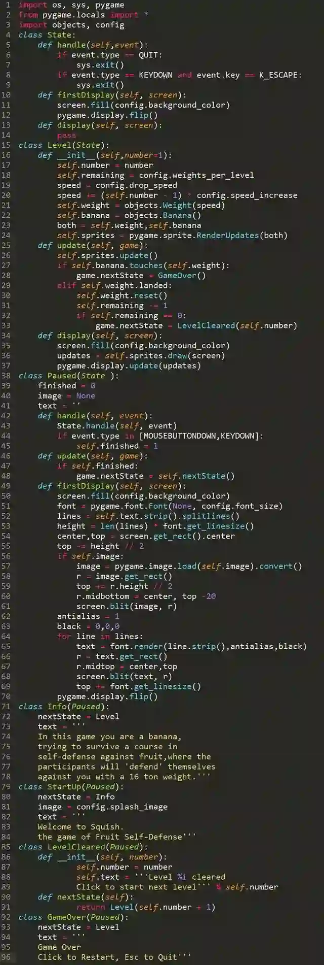 其中用户判断部分就是Paused类中的update方法和handle方法,而系统判断就是Level类中的update方法。还有一个要注意的地方就是Level类中update方法中的第一行代码:self.sprites.update(),这是让铁块不断下落的关键代码。用户判断部分的代码已经有了,下面需要贴上系统判断时用到的代码.