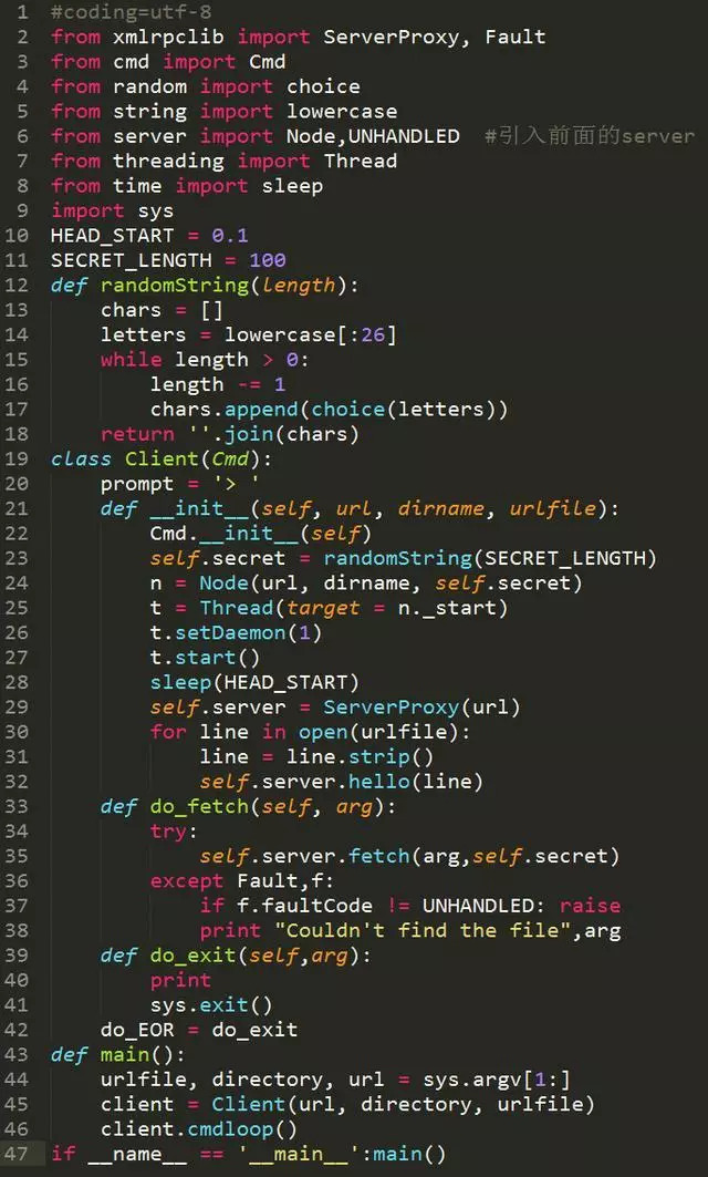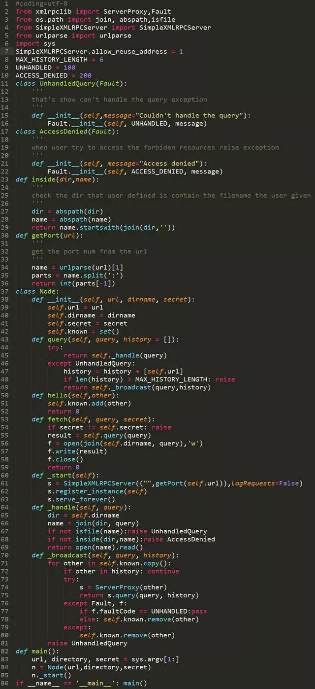 PS:上面的程序只能传输文本文件,大文件或者其他格式的文件无法传输,刚才研究了一下,使用xmlrpclib这个库中的Binary函数即可,具体使用访问为: 先引入xmlrpclib,import xmlrpclib 在server类的的_handle方法中最后返回的那句代码return open(name).read() 修改为 return xmlrpclib.Binary(open(name,'rb').read()) 再把fetch方法中的f.write(result)修改为f.write(result.data) 另外这句话前面的那个写文件的方式要改为wb。