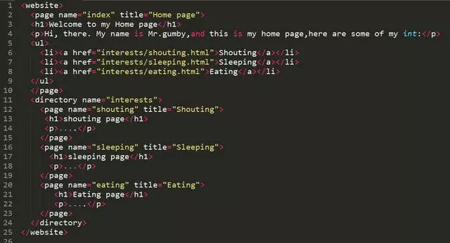 这个项目的名称与其叫做万能的XML不如叫做自动构建网站,根据一份XML文件,生成对应目录结构的网站,不过只有html还是太过于简单了,如果要是可以连带生成css那就比较强大了。这个有待后续研发,先来研究下怎么html网站结构。 既然是通过XML结构生成网站,那所有的事情都应该由这个XML文件来。先来看下这个XML文件,website.xml: