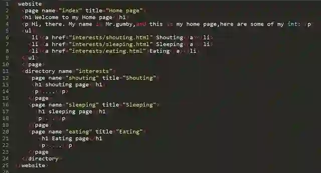有了上面的这些认识,我们已经知道如何处理xml文件了,然后再来看那个罪恶的源头website.xml文件,分析其结构,只有两个节点:page和directory,很明显page表示一个页面,directory表示一个目录。