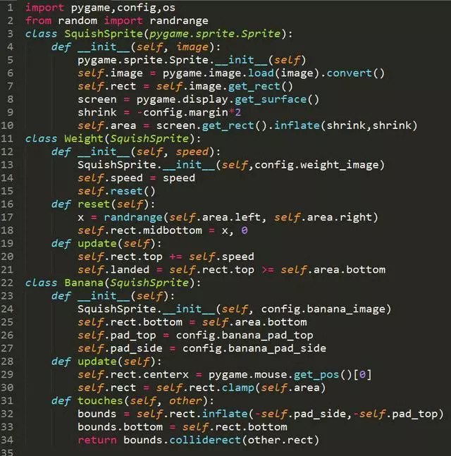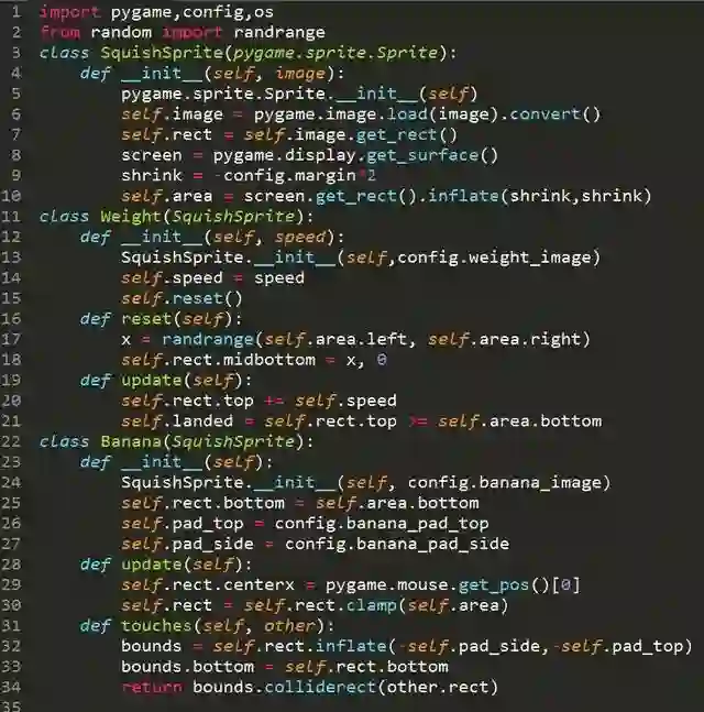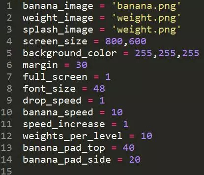 1、整体上代码有一个配置模块,来对游戏的速度、屏幕的宽度、香蕉移动速度、字体大小、各个物体的图片等进行配置。