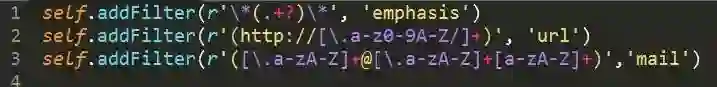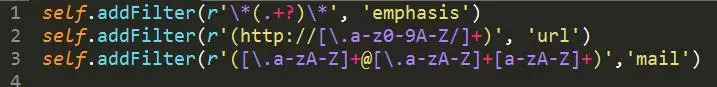 这就是三个过滤器了,分别是:强调牌过滤器(用×号标出的),url牌过滤器,email牌过滤器。熟悉正则表达式的同学理解起来是没有压力的。