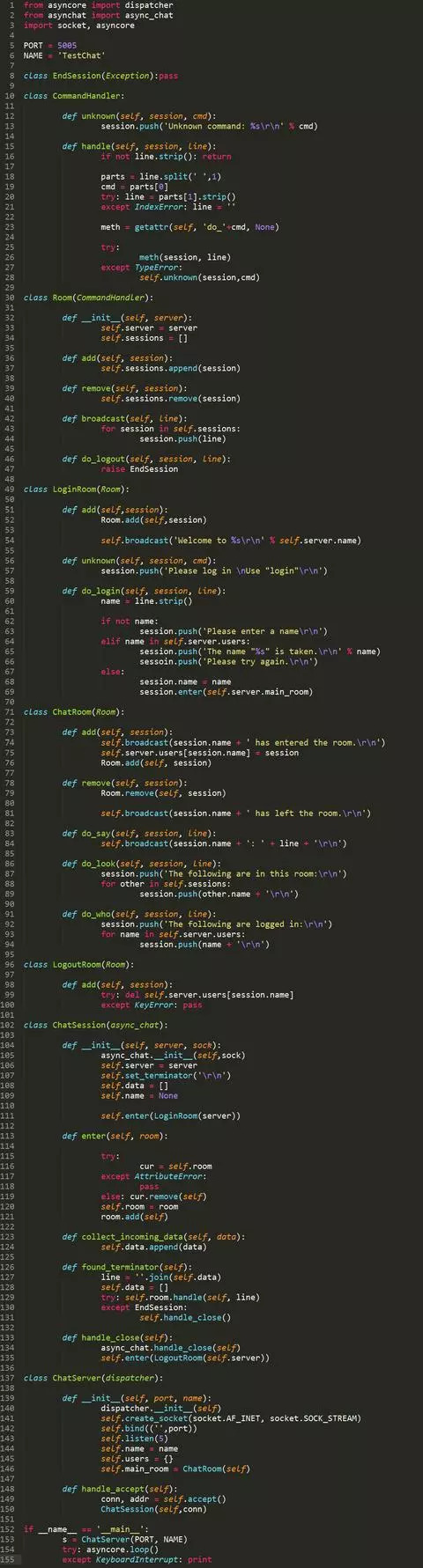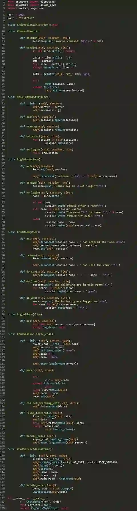 🔹 存储每个客户端的连接session,处理每个连接发送的消息:ChatSession类,这个类的作用很简单,接受数据,判断是否有终结符,如果有调用found_terminator这个方法。