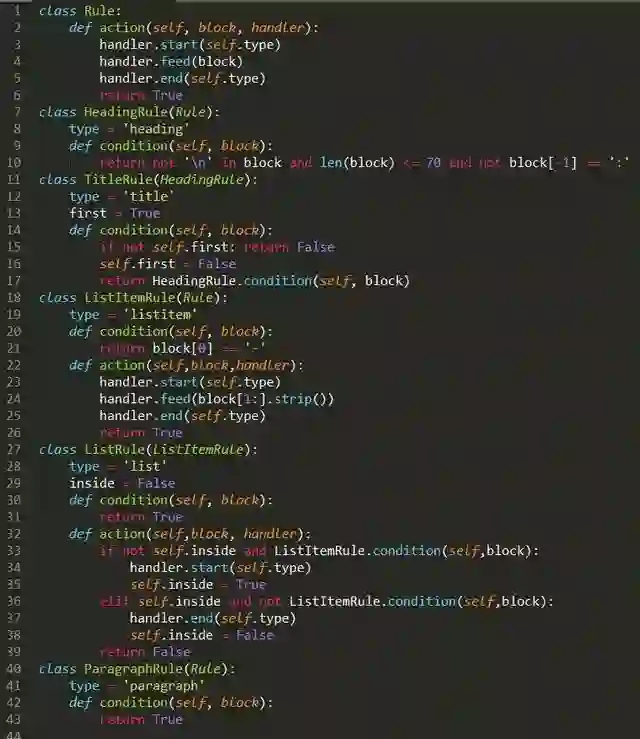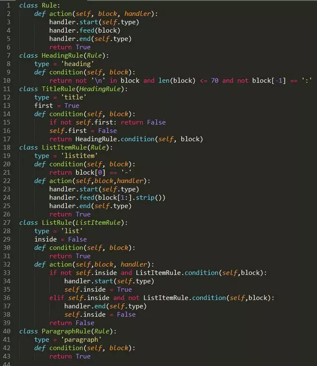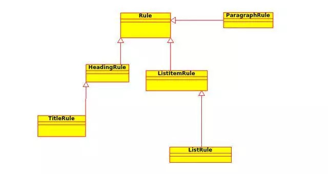 再来看第三个模块“规则”,这个模块,抛开那祖父类不说,其他类应该有的两个方法是condition和action,前者是用来判断读进来的字符串是不是符合自家规则,后者是用来执行操作的,所谓的执行操作就是指调用“处理程序模块”,输出前标签、内容、后标签。 来看下这个模块的代码,其实这个里面几个类的关系,画到类图里面看会比较清晰。 rules.py: