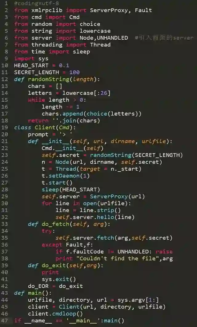 里面在urlsA.txt中写入:http://localhost:4243,然后开启两个命令行,第一个输入:python client.py urlsA.txt A http://localhost:4242 回车,是不是出来提示符了。输入fetch B.txt回车,看到提示Couldn't find the file B.txt。