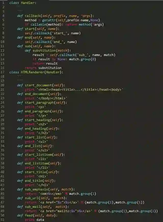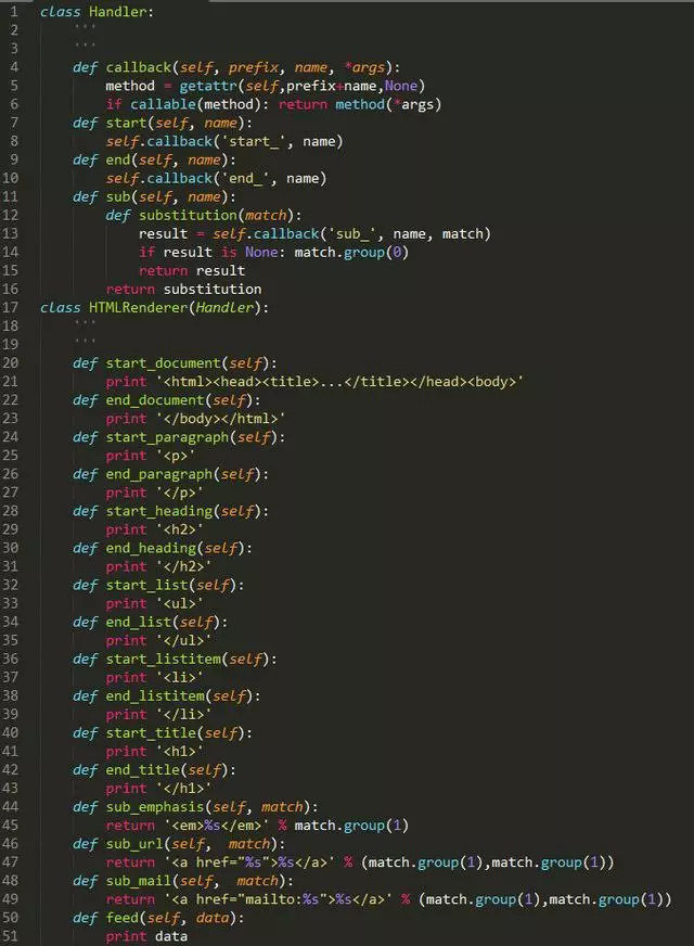 先来说处理程序模块,这个模块的作用有两个,一个是提供那些固定的html标记的输出(每一个标记都有start和end),另一个是对这个标记输出的开始和结束提供了一个友好的访问接口。来看下程序handlers.py: