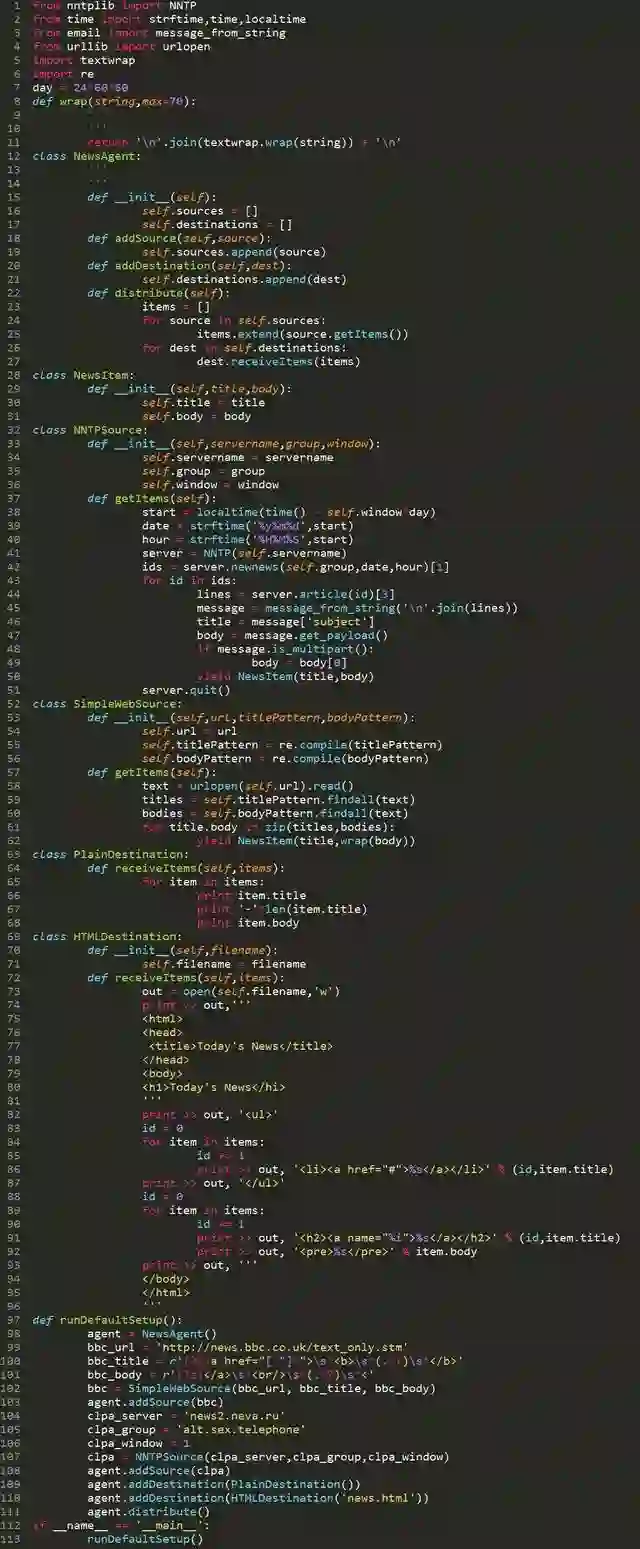 这个程序,首先从整体上进行分析,重点部分在于NewsAgent,它的作用是存储新闻来源,存储目标地址,然后在分别调用来源服务器(NNTPSource以及SimpleWebSource)以及写新闻的类(PlainDestination和HTMLDestination)。所以从这里也看的出,NNTPSource是专门用来获取新闻服务器上的信息的,SimpleWebSource是获取一个url上的数据的。而PlainDestination和HTMLDestination的作用很明显,前者是用来输出获取到的内容到终端的,后者是写数据到html文件中的。