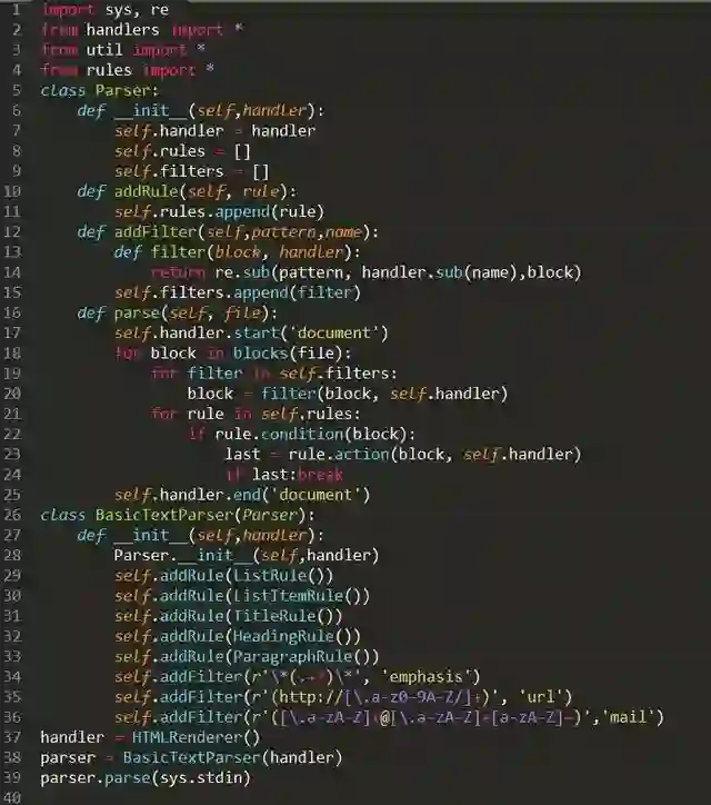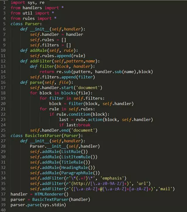 最后隆重的来看下“语法分析器模块”,这个模块的作用其实就是协调读入的文本和其他模块的关系。在往重点说就是,提供了两个存放“规则”和“过滤器”的列表,这么做的好处就是使得整个程序的灵活性得到了极大的提高,使得规则和过滤器变成的热插拔的方式,当然这个也归功于前面在写规则和过滤器时每一种类型的规则(过滤器)都单独的写成了一个类,而不是用if..else来区分。 看代码: