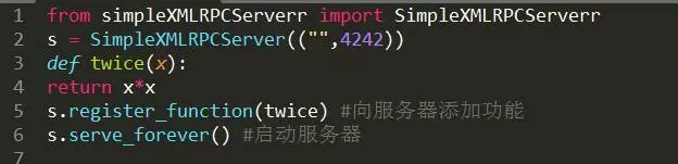 from xmlrpclib import ServerProxy s = ServerProxy('http://localhost:4242') s.twice(2) #通过ServerProxy调用远程的方法,