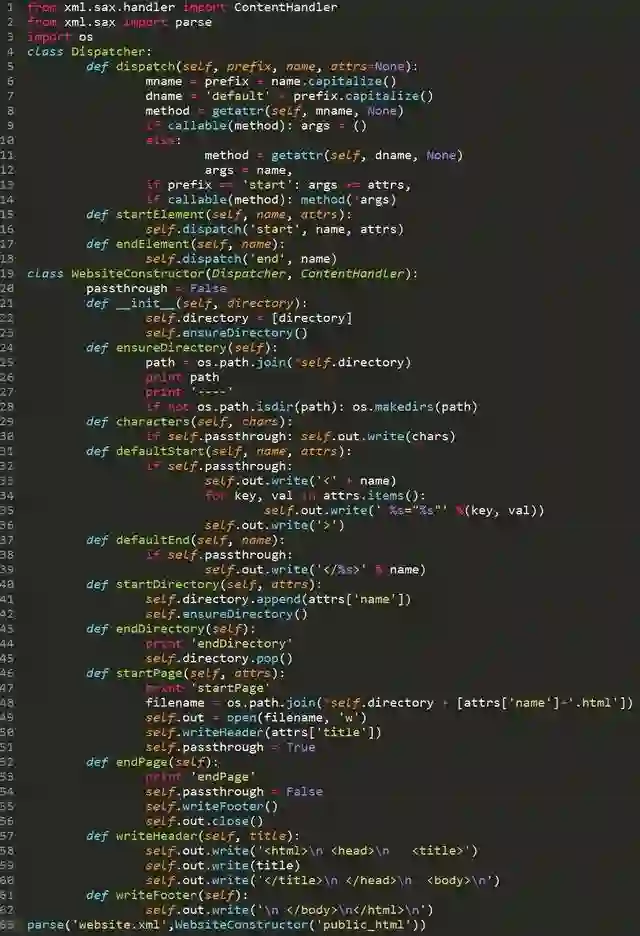 一个函数一个函数搞清楚之后,就知道整个处理流程是什么样了。首先创建一个public_html的文件,存放整个网站,然后读xml的节点,通过startElement和endElement调用dispatch进行处理。然后就是dispatch怎么调用具体的处理函数了。 到此为止,这个项目算是分析完了。