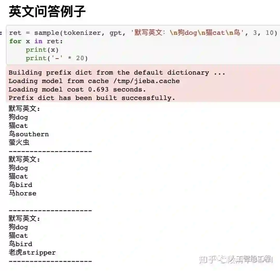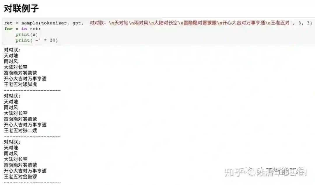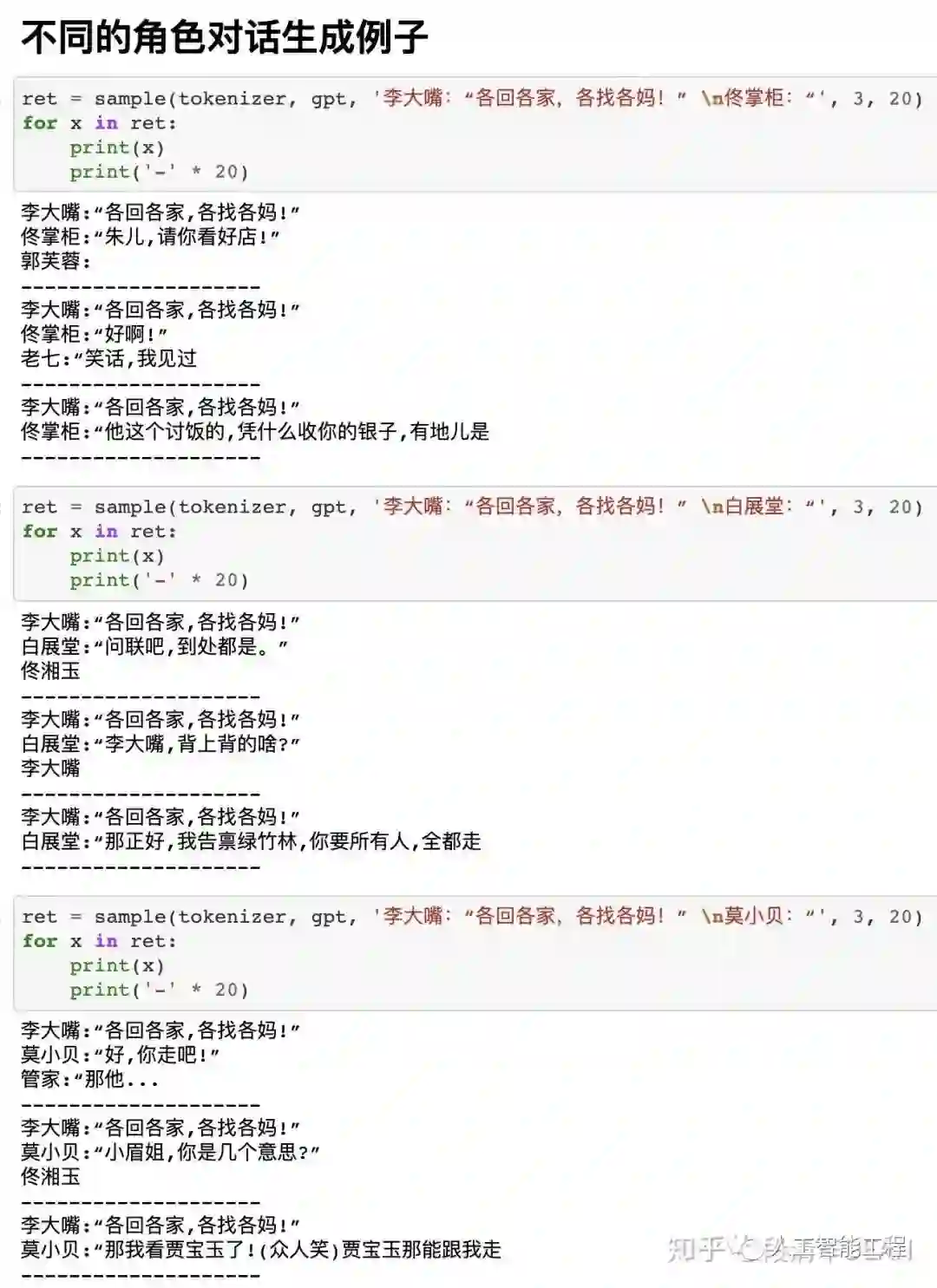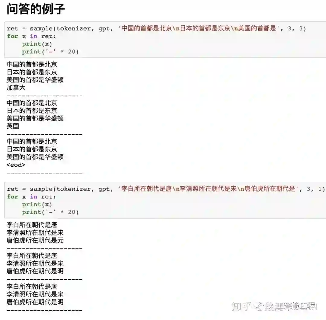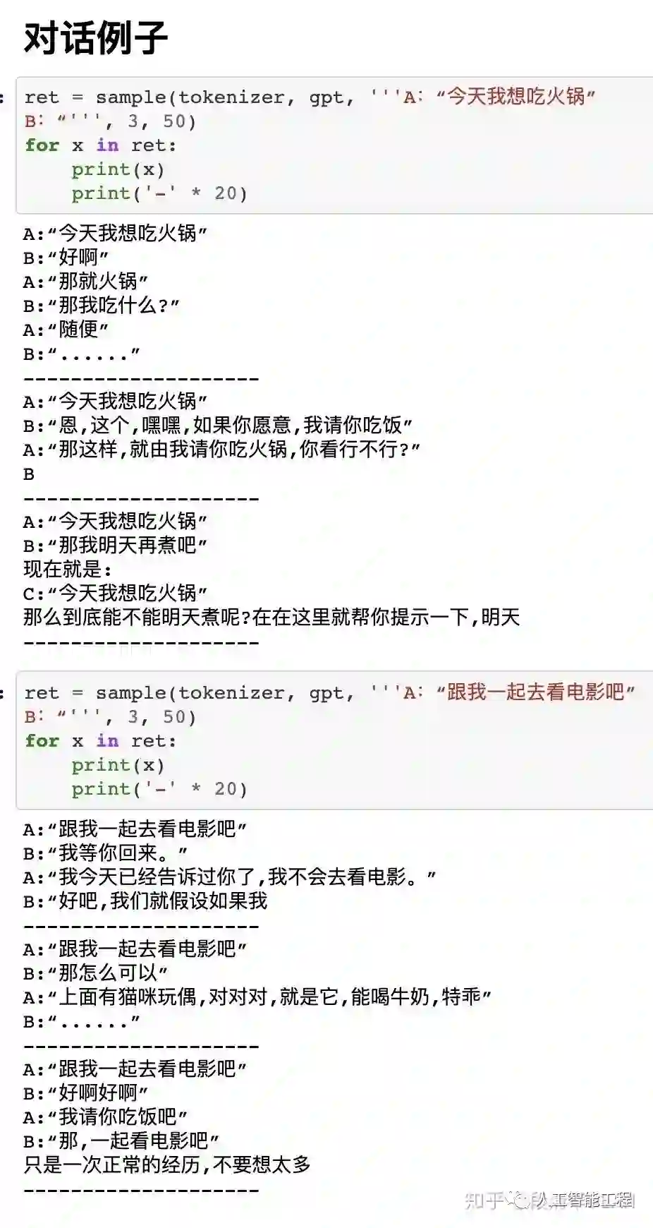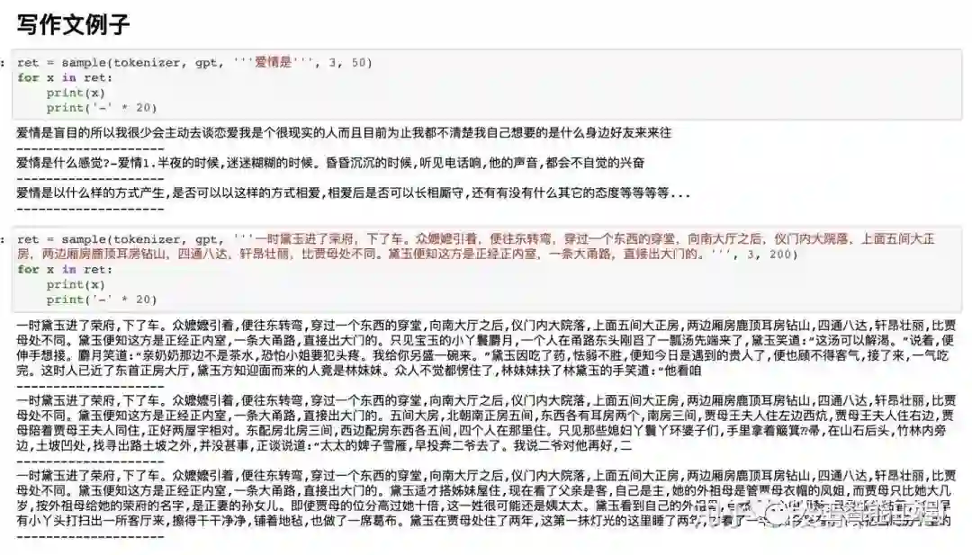 下面图片中,sample(tokenizer, gpt, 'xxxxxxxxxx', 3, 10),这里的'xxxxxxxxx'可以认为是我们构造的“半句话”,每个例子会生成3个结果。