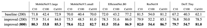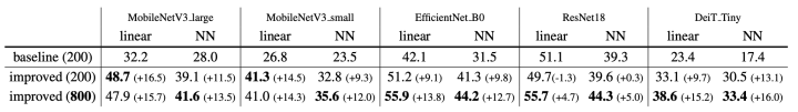 接下来我们将以上经过验证的simple tricks合并,在5个架构的小模型上进行基准测试,来判断这些trick的有效性。我们得到了表2(linear evaluation protocol)以及表3(transfer learning results)。