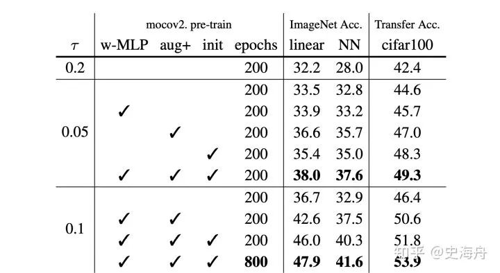 我们可以采用一些看起来fancy的方法来解决over clustering,但我们更希望自己的工作能够给未来的研究做一个铺垫,因此只验证一些看起来合理并且简单的手段,包括:温度( )、负样本数量、数据增广方案、权重初始化质量,以及projector架构。碍于篇幅限制,我们在这里仅仅给出猜想和一些重要的结论,不会涉及其中的实验数据和细节,感兴趣的小伙伴可以看我们的原文~