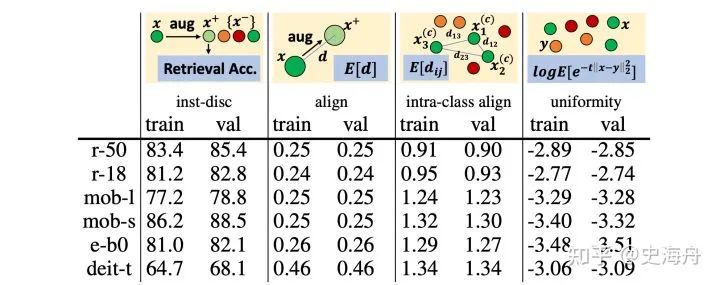 首先我们设置一系列用于评价模型表征空间的评测指标。前置任务相关的评测指标包括alignment、uniformity,以及instance discrimination accuracy. 下游任务相关的评测指标包括intra-class alignment、linear evaluation protocol,以及best-NN。其中intra-class alignment计算的是类内平均距离,使用了标签信息进行评测,它和之前的工作[5]中的tolerance在“单位球面表征空间”的约束下是等价的。而best-NN是我们提出的为了弥补原有的k-NN评测方法缺陷的新的评测指标:不同模型的表征空间可能在不同的超参k情况下能够达到表现的最优值,因此我们遍历 寻找最优的k-NN准确度作为模型的best-NN表现。其余的指标alignment/uniformity/linear evaluation protocol相信大家已经比较熟悉,这里就不再赘述。