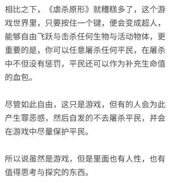 而《虐杀原形》在残杀平民的时候反而会得到回血的奖励,鼓励主角去作恶,就让这款游戏相当恶劣了。但说到底游戏只是游戏,关键在于玩游戏的人。“有的人会产生罪恶感,去保护游戏中的平民。”这位道长说。