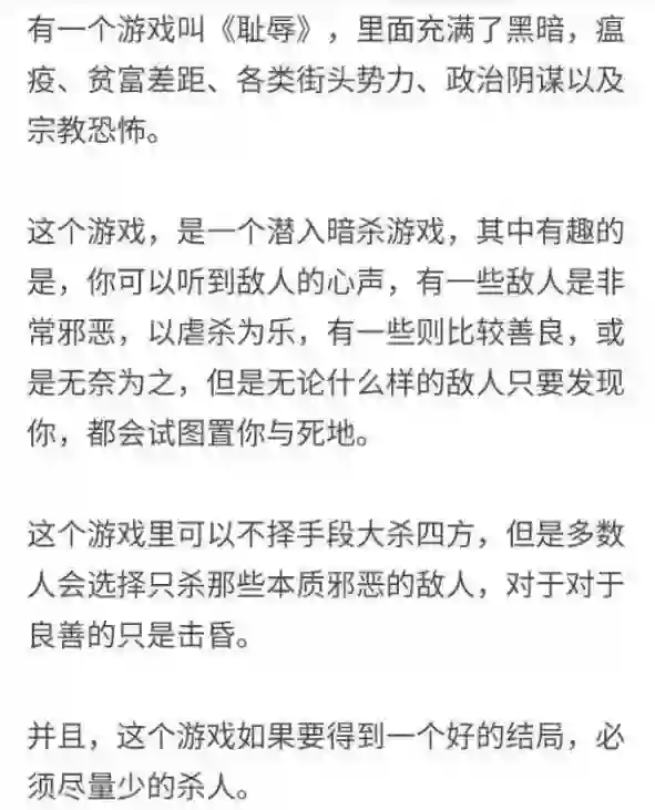 他认为《耻辱》是款好游戏,你可以选择杀死敌人,也可以选择不伤害他或者只是击晕他。如果想获得一个好的结局,必须尽量减少杀人的设定,就像现实中的“因果报应”一样,本质是教人向善的。