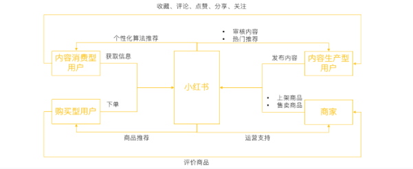 根据小红书ugc和电商两大业务板块,将小红书用户氛围:内容消费型、内容生产型用户、购买型用户、商家。死者与小红书间的核心业务逻辑如下: