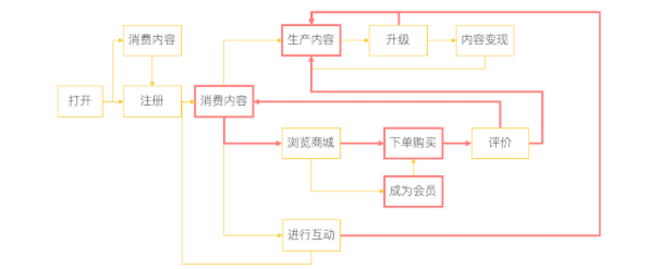 小红书用户核心使用路径根据用户类型分为消费内容、生产内容、下单购买三条。消费内容为所有核心路径的基础。