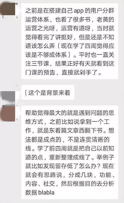 在学习这门课程的时候,巴尔坦星人正在着手搭建公司APP的用户运营体系,但,看完很多市面上的书还是不知道应该怎么做,因为希望可以从课程中学到真正能够实操可落地的方法 ,于是,她在第1期开放报名的时候就立刻报名参加了课程。