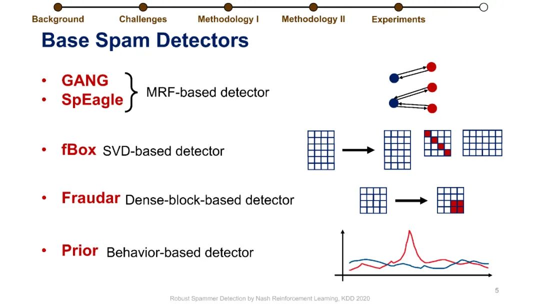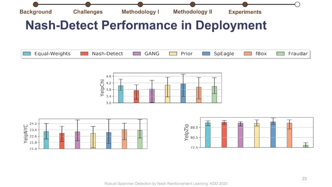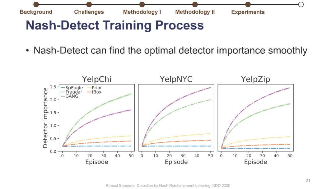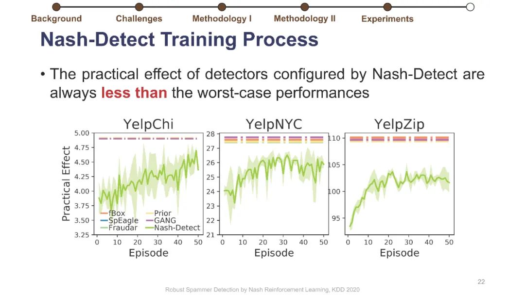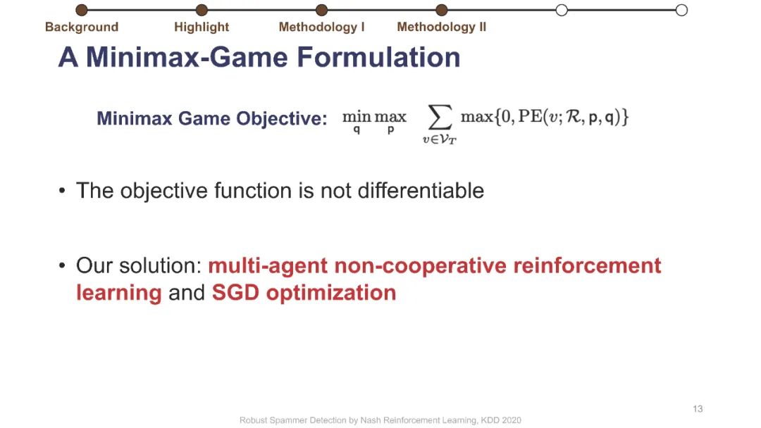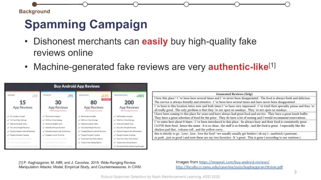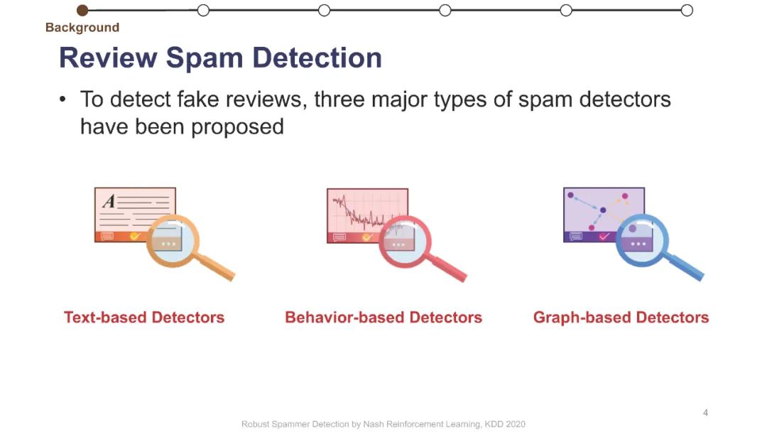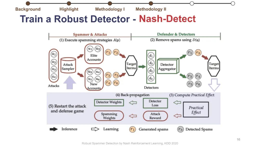在线评论为客户提供产品评估以做出决策。不幸的是,这些评估可能会被专业的垃圾邮件发送者使用虚假的评论(“垃圾邮件”)来操纵,而这些专业的垃圾邮件发送者通过适应部署的检测器,已经学会了越来越阴险和强大的垃圾邮件发送策略。垃圾邮件策略很难捕捉,因为随着时间的推移,它们会迅速变化,垃圾邮件发送者和目标产品之间也会不同,更重要的是,在大多数情况下,它们仍然是未知的。此外,现有的大多数检测器关注的是检测精度,这与保持产品评价的可信度的目标不是很一致的。为了解决这些挑战,我们制定了一个极大极小游戏,垃圾邮件发送者和垃圾邮件检测器在他们的实际目标上相互竞争,而不仅仅是基于检测的准确性。博弈的纳什均衡导致稳定的检测器,对于任何混合检测策略都是不可知的。然而,对于典型的基于梯度的算法来说,该博弈没有封闭形式的解,不可微。我们将博弈转化为两个依赖的马尔可夫决策过程(MDPs),以实现基于多武装强盗和政策梯度的高效随机优化。我们在三个大型综述数据集上使用各种最新的垃圾邮件发送和检测策略进行了实验,结果表明,该优化算法能够可靠地找到一种均衡检测器,能够有效地防止使用任何混合垃圾邮件发送策略的垃圾邮件发送者达到他们的实际目标。我们的代码可以在https://github.com/YingtongDou/Nash-Detect获得。