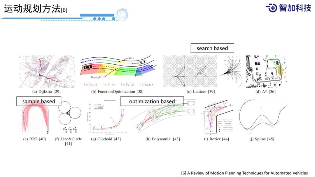 3. Optimization based:对于自动驾驶车辆,optimization based会将规划的结果通过曲线的形式来表示,比如Polynomial、Bezier、Spline,通过多段的具有解析解的曲线形式来表示,从而将规划问题转化成求解曲线的参数问题,这样比较好处理加一些想要的约束,转化成优化问题,对于优化问题,我们有很多的求解方法,比如NLP、QP等。optimization based方法的好处是可以有很多不同的function,可以满足不同的目标,并且很直观求解速度也很快;它的问题是多个目标的权重如何加?求解的最优解一般都比较贴近约束的边界,如何来处理这些问题?而且并不能把所有的问题都很好地转化成一个优化问题,也不是所有的优化问题都有解,比如非线性优化求解起来比较麻烦,是不是凸的、非凸的,这都是一些问题。