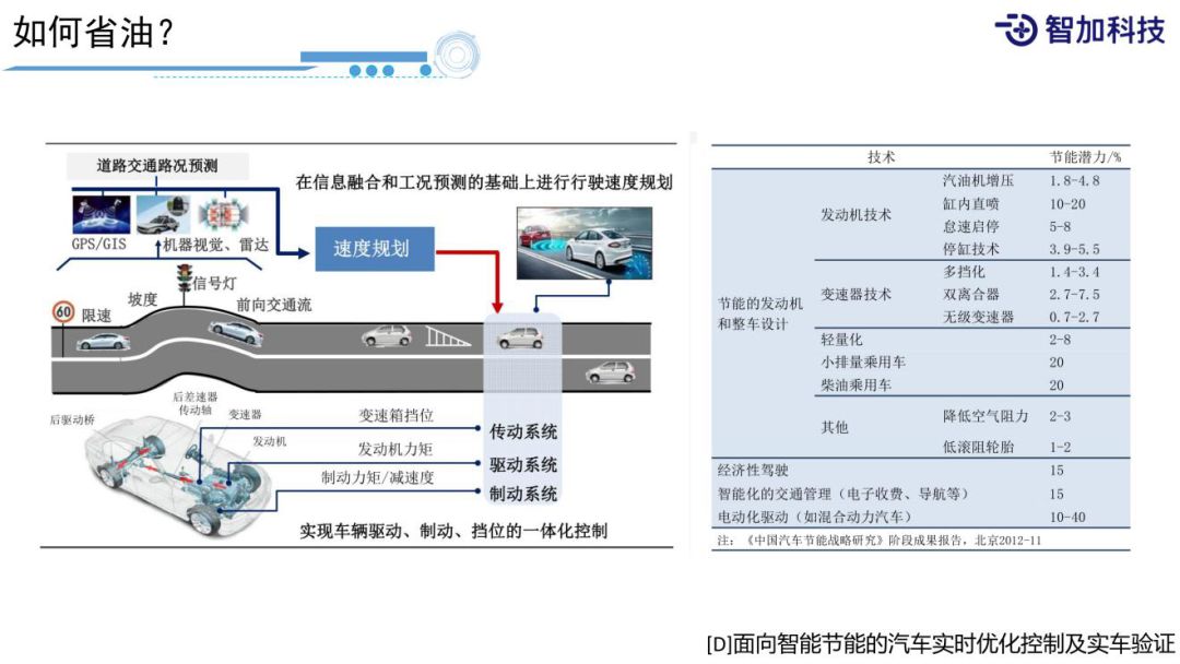 如何省油,这是从一个文献中截取的如何省油的可能措施。比如可以利用道路的坡度信息,上坡提前减档、提前加速,下坡可以让它溜一溜,提前感知道路前面车流的速度,提前减速,或者是信号灯提前委托等等。通过经济性驾驶,采用不同的自动驾驶策略,可以节能15%,看起来这些技术还是比较可观的。不过,节油的一些策略,会带来一些安全性上的隐患,比如最常用的溜坡,能不能溜?这对我们的要求还是很高的。