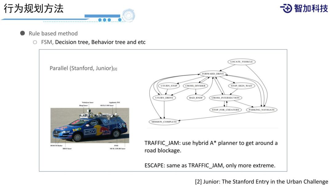 现在最常用的Behavioral Planning方法是有限状态机 ( FSM,Finite State Machine ),就是有限状态机模型的Rule based method,它为什么是最常用的呢?因为其简单、有效、明确,主要通过定义一些状态,以及定义一些状态之间的转移条件和状态之间相互约束的条件,最后,通过有限状态的模型来处理我们面对的未知的复杂的环境,可以使机器人在没有遇到过的环境中做出比较正确的决策。如上图,DARPA挑战赛的时候,斯坦福团队的Junior就采用了有限状态机模型防止交通拥堵;另外在Apollo代码中,也通过有限的scenario以及stage之间的transform来实现在道路上不同的运动之间的决策。这种方法的好处是简单明确,缺点是很难通过定义有限的状态来处理一个很复杂的事情。因为实际道路上,可能会遇到很多很复杂的情况,很多都没有遇到过,只是采用有限的状态和有限的行为,很难把它处理的很好。