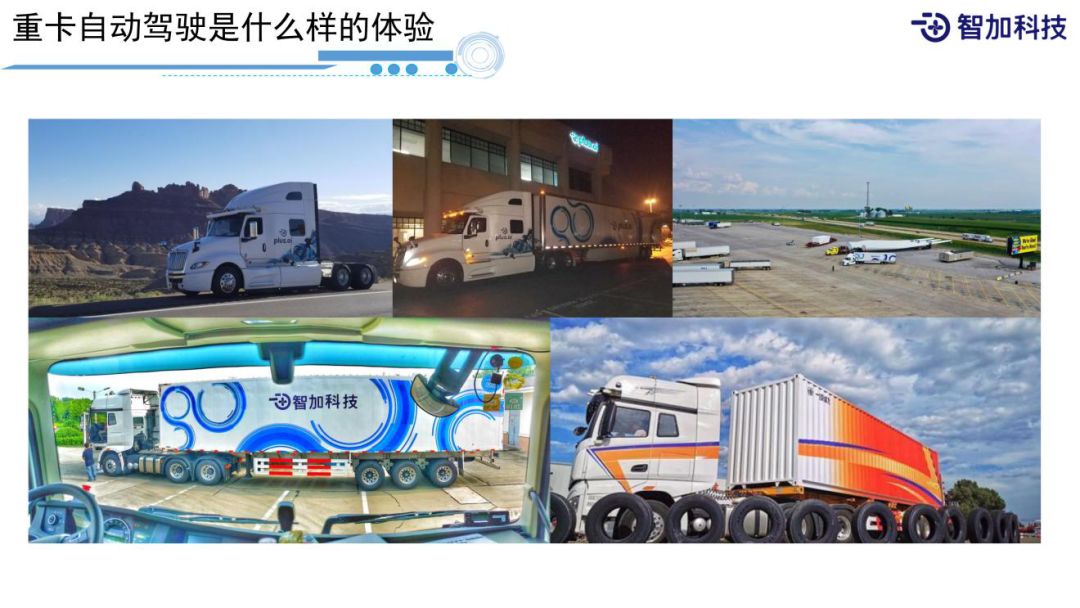 我们可以想象下,这种重型卡车的乘坐体验。面对这种重型卡车,第一反应就是车特别高,然后跟小车相比它的视角也不太一样,比如当前面有辆车,重卡在刹车的时候给你的感觉就像你要从前面车碾过去一样。当重卡带挂之后,如上图,这是我们在美国机场的测试,带了挂之后,整体看起来特别庞大、笨重。