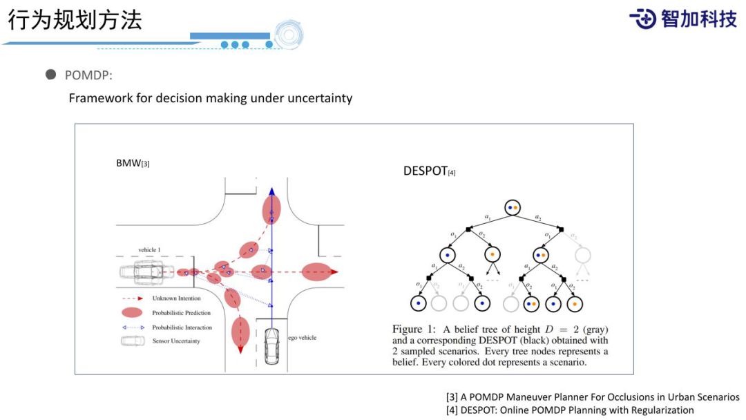 另一个比较常用的方法是POMDP,是一个将uncertainty考虑到decision making过程中的框架。所谓uncertainty,对于有规划经验的人,经常会抱怨,因为我们的上游是感知组,感知可不可以准点,不要有那么多噪音,感知的同学又说到,传感器能不能给准点,大家都有抱怨。但实际情况是,世界肯定是不确定的,所有感知的结果,包括感知的类型、位置,(如左图,可以看到左边的来车,它的位置在这个区域内是服从一定的概率分布的,并不是一个确定的结果,包括它未来的行为,有可能左转、右转或者直行,它的intention和轨迹都是不确定的。我们在规划时,怎样把这种不确定性考虑到规划中?