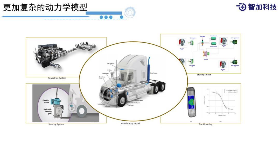 另外,无人重卡的动力学模型会更加复杂,可以理解成这个人比较胖,跑起来比较费劲,没有那么灵活。我们一般对重卡建模会把它拆分成几个系统,动力系统、刹车系统、转向系统和轮胎模型来分别建模。这些系统的动态响应特性比乘用车的响应特性是差很多的,也就是它的动力学特性比较复杂,响应没有那么好,不是想让它停就停。