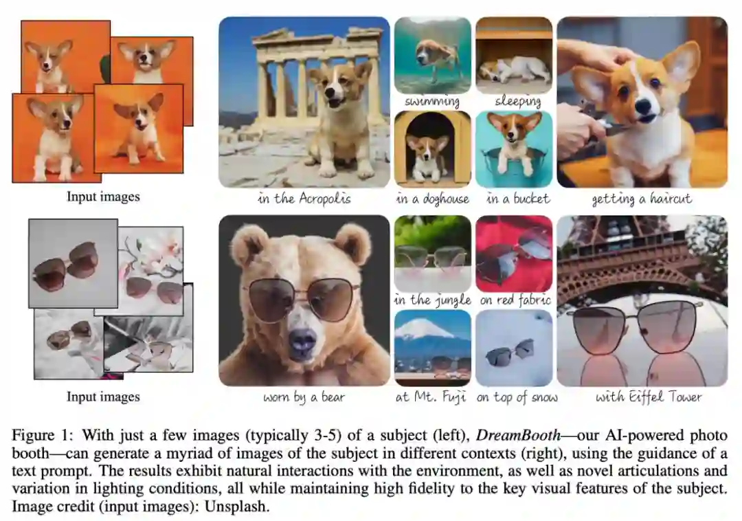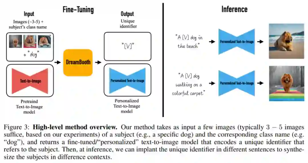 更具体的说,本文方法将一个主题(例如,一只特定的狗)和相应类名(例如,狗类别)的一些图像(通常 3 - 5 张图)作为输入,并返回一个经过微调 / 个性化的文本到图像模型,该模型编码了一个引用主题的唯一标识符。然后,在推理时,可以在不同的句子中植入唯一标识符来合成不同语境中的主题。