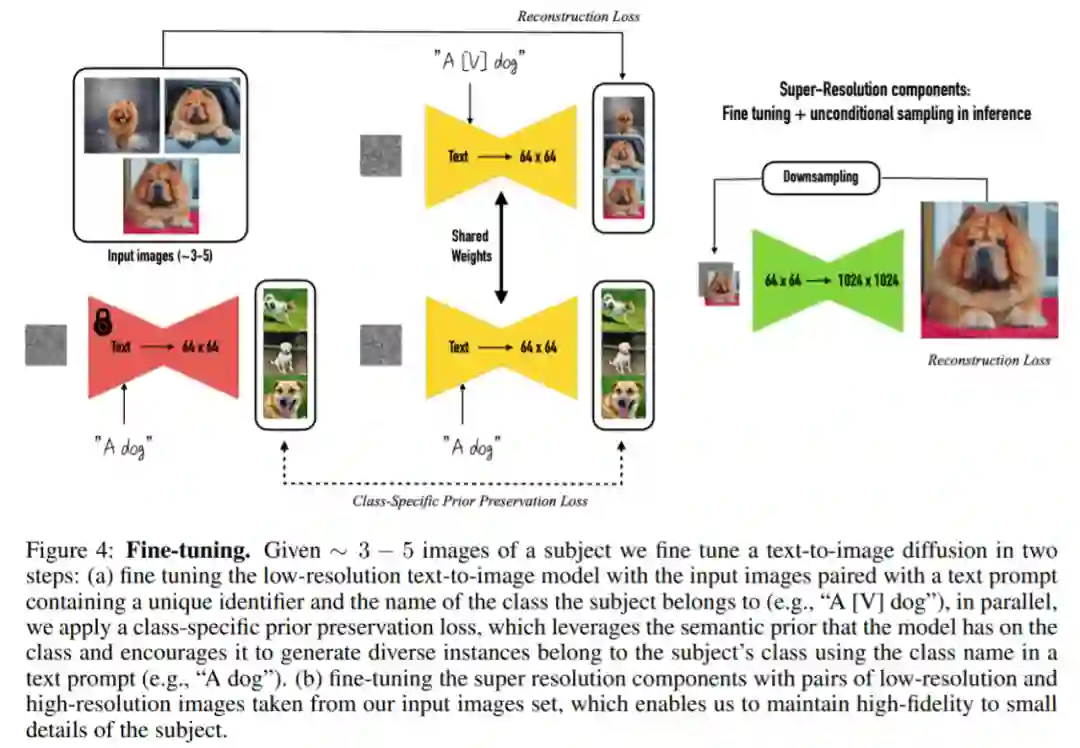 为了保留图像细节,该研究发现应该对模型的超分辨率(SR)组件进行微调,本文在经过预训练的 Imagen 模型的基础上来完成。具体过程如图 4 所示,给定同一主题的 3-5 张图像,之后通过两个步骤微调文本到图像的扩散模型: