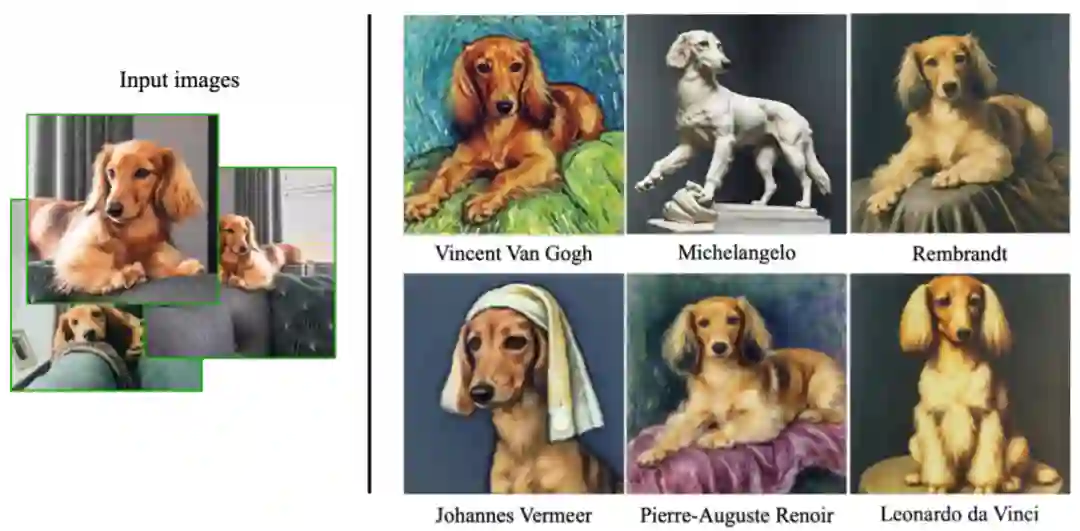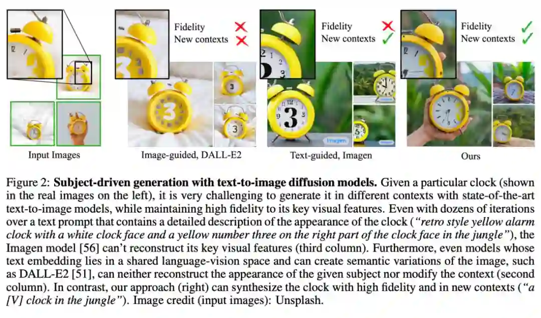 虽然这些模型的合成能力是前所未有的,但它们缺乏模仿给定参考主题的能力,以及在不同场景中合成主题相同、实例不同的新图像的能力。可见,已有模型的输出域的表达能力有限。