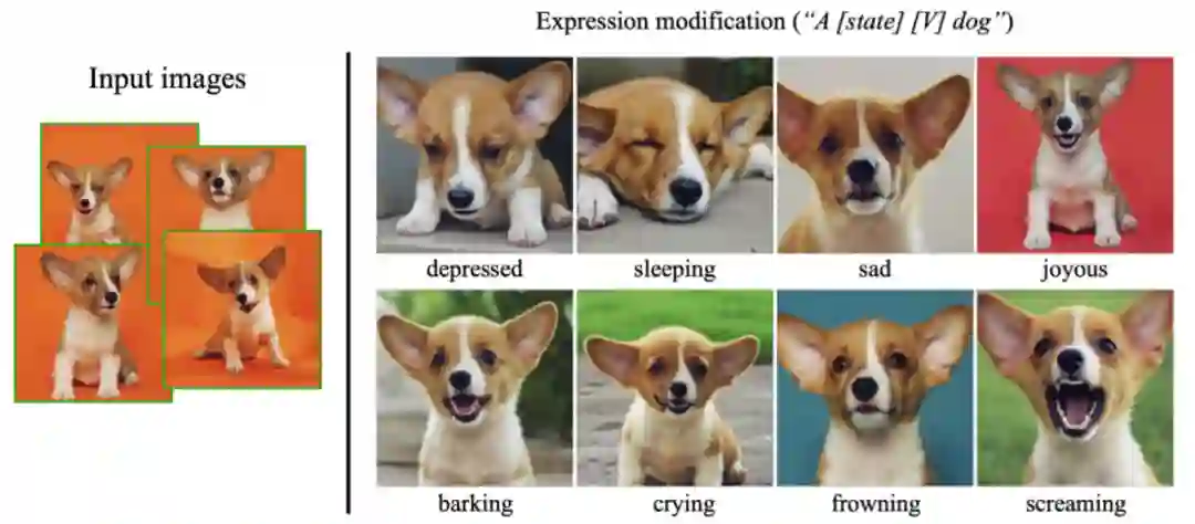 给定 3-5 张捕获的图像,这些图像没有文字描述,本文旨在生成具有高细节保真度和由文本提示引导变化的新图像。该研究不对输入图像施加任何限制,并且主题图像可以具有不同的上下文。方法如图 3 所示。输出图像可对原始图像进行修改,如主题的位置,更改主题的属性如颜色、形状,并可以修改主体的姿势、表情、材质以及其他语义修改。