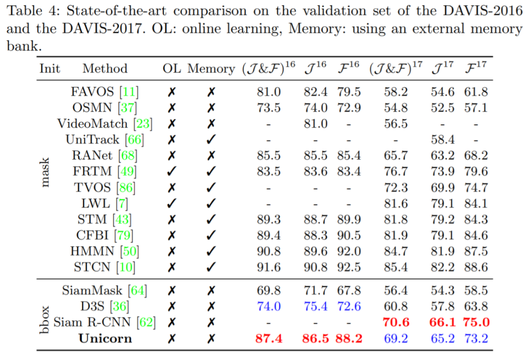 DAVIS-16 在验证集中包含 20 个视频,每个序列中只有一个跟踪目标。图 4 表明 Unicorn 在使用边框初始化的方法中取得了最好的结果,甚至超过了使用掩码初始化的 RANet 和 FRTM。