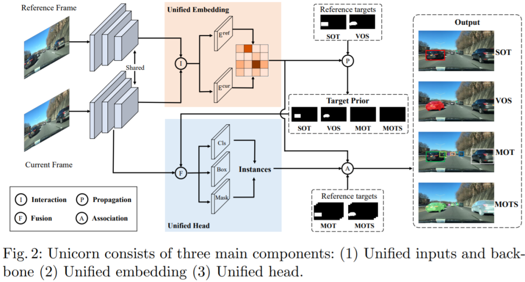 Unicorn 由三个部分组成:统一输入与主干、统一嵌入、统一头。三个组件分别负责获得强大的视觉表征、建立精确的对应关系和检测不同的跟踪目标。Unicorn 的框架如图 2 所示。给定参考帧 I_ref、当前帧 I_cur 和参考目标,Unicorn 旨在通过统一的网络预测当前帧上跟踪目标的状态,以用于四个任务。