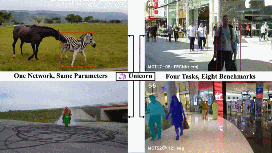 现在,来自大连理工大学、字节跳动和香港大学的研究者提出了一种统一的方法,称为 Unicorn,它可以使用相同的模型参数通过单个网络同时解决四个跟踪问题(SOT、MOT、VOS、MOTS)。