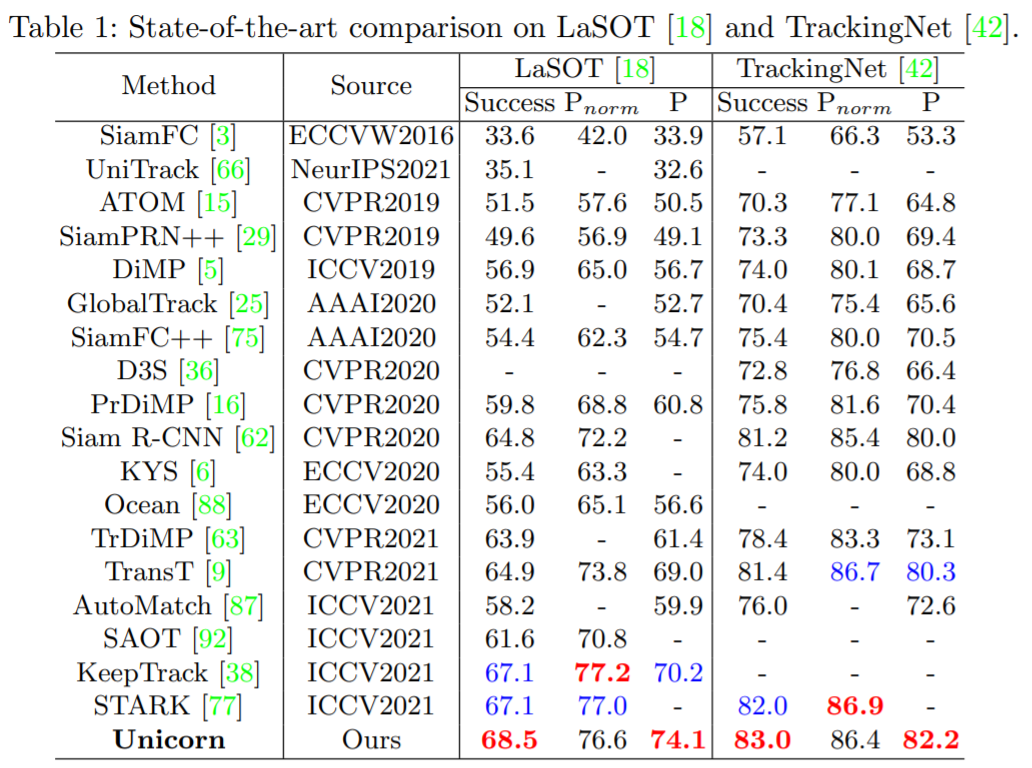 LaSOT:LaSOT 是一个大规模的长期跟踪基准,测试集中包含 280 个视频,平均长度为 2448 帧。表 1 显示 Unicorn 实现了新的 SOTA 成功率和精度,分别为 68.5% 和 74.1%。值得注意的是,Unicorn 以更简单的网络架构和跟踪策略,大大超过了之前最好的基于全局检测的跟踪器 Siam R-CNN(68.5% vs 64.8%)。