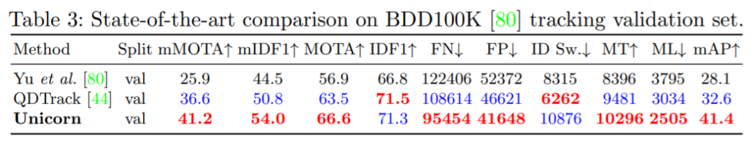 BDD100K 是一个大规模的视觉驾驶场景数据集,需要跟踪 8 类实例。如表 3 所示,Unicorn 取得了最佳性能,在验证集上大大超过了之前的 SOTA 方法 QDTrack。具体来说,mMOTA 和 mIDF1 的提升分别高达 4.6% 和 3.2%。