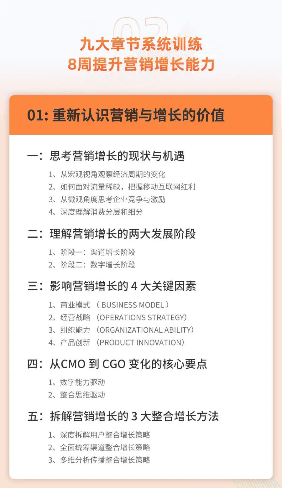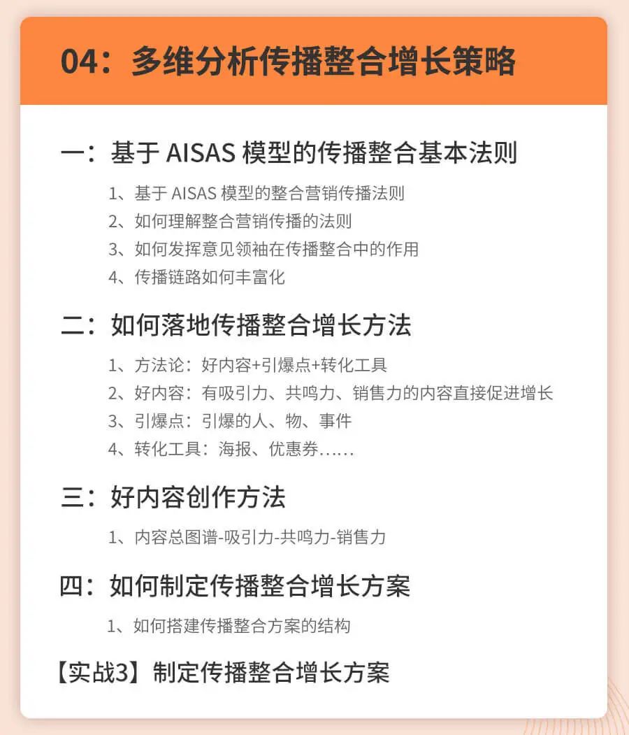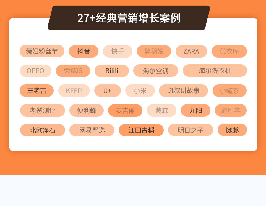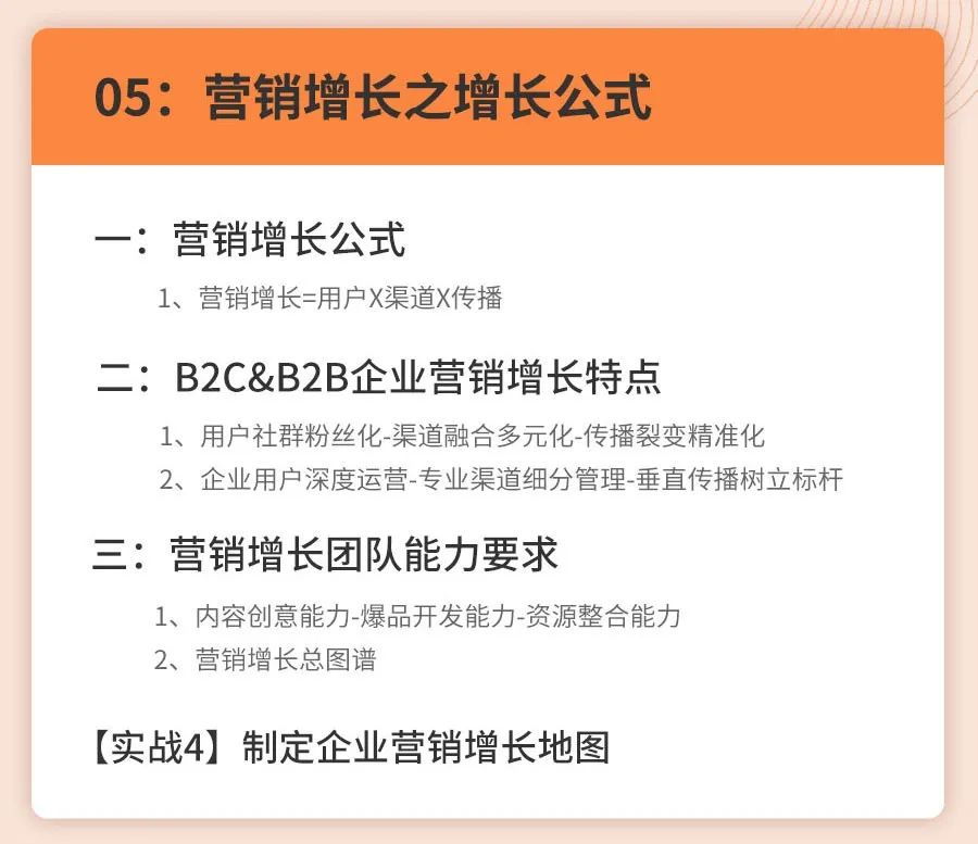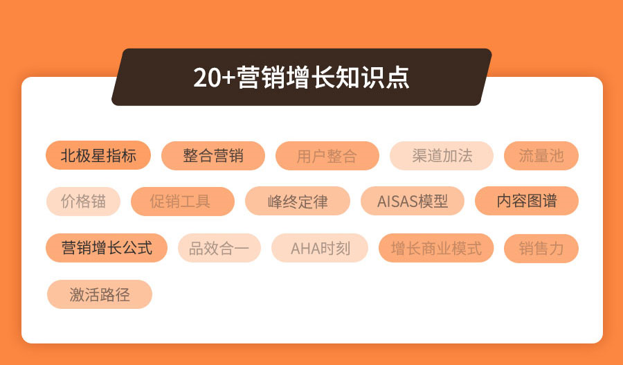 课程内容侧重给大家搭建营销增长四个模块的思维框架,配合案例拆解+实战演练的形式,老师线下深度沟通去辅助理解整个知识框架和落地思路。