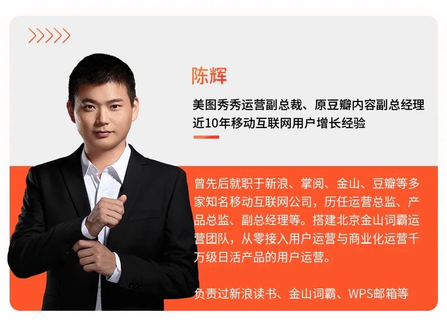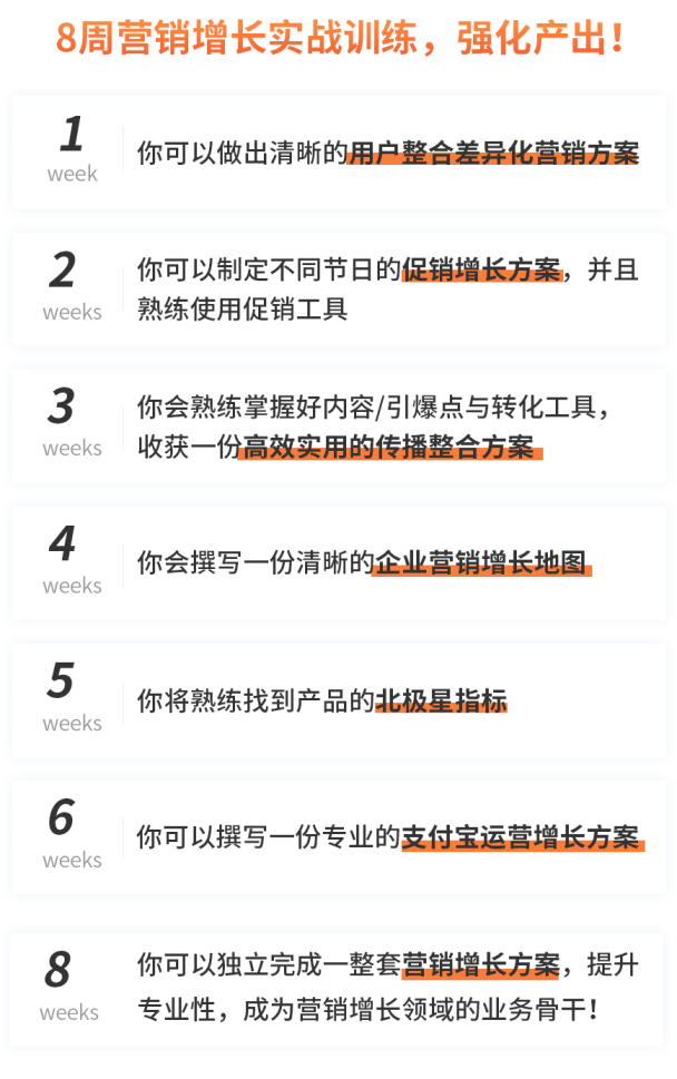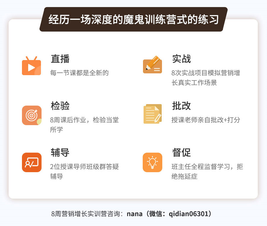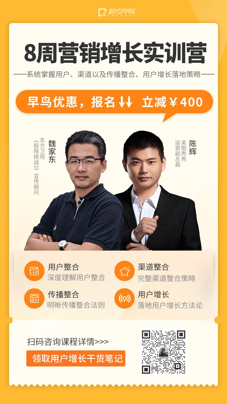 为此,这里推荐由起点学院联合美图秀秀运营副总裁@陈辉老师、《极限挑战3》宣传顾问@魏家东老师,共同打磨迭代的线上【8周营销增长实训营】