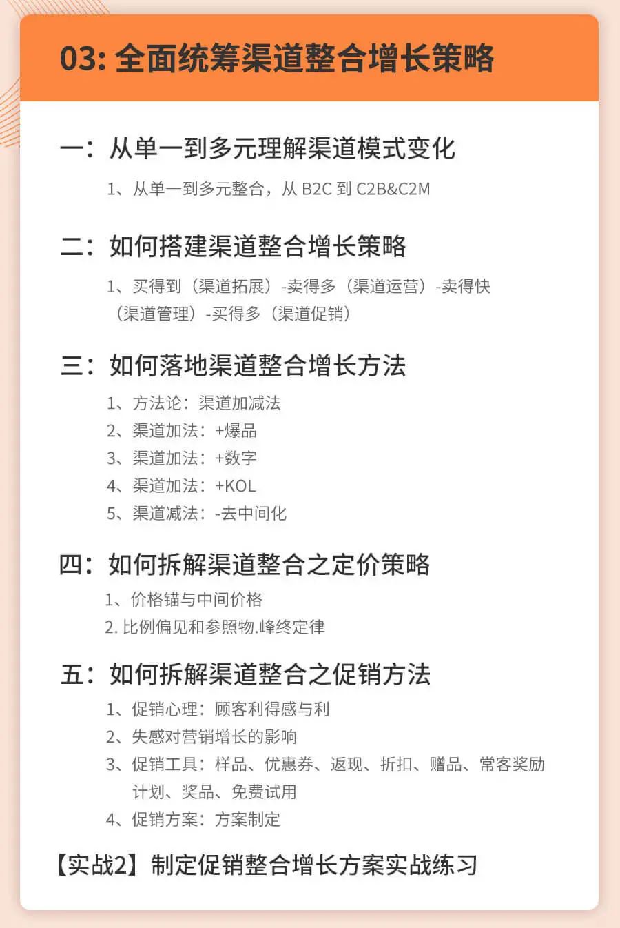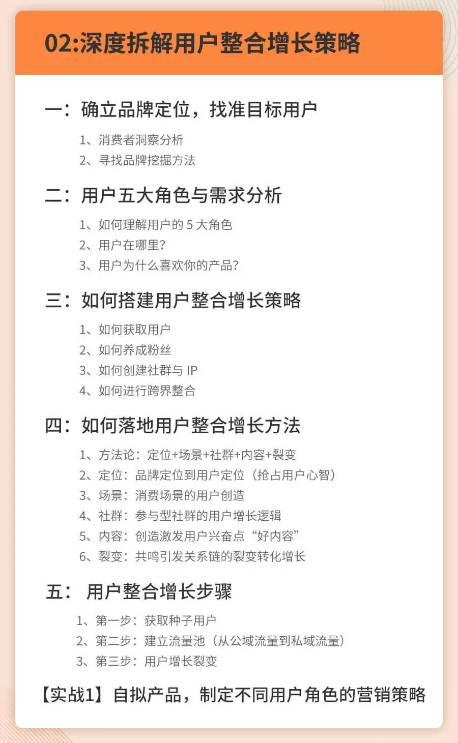 从用户整合、渠道整合、传播整合、用户增长四大维度全方位地讲解了互联网人如何提升营销增长能力,既有底层逻辑的框架讲解,也有导师自己实战案例的解析。