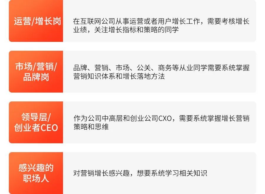这门课程可以帮助运营岗、市场/营销/品牌岗、领导层/创业者、对营销增长感兴趣的职场人,更好的理解和掌握完整的知识体系,能帮你搭建营销增长的底层框架。