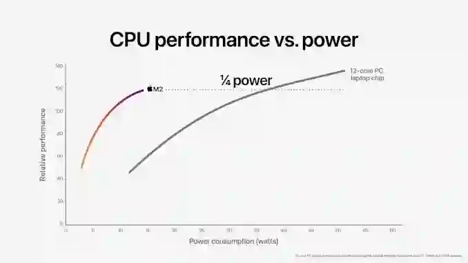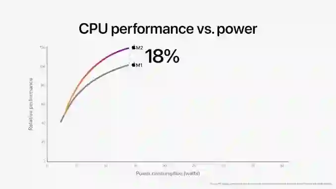 苹果还声称同功率下 M2 的性能是配备 16GB 内存的 10 核英特尔酷睿 i7-1255U 处理器的 1.9 倍。