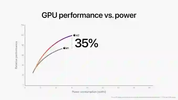 结合更多的核心数量和 GPU 时钟速度的增加(基于 TFLOPS 推测似乎增加了 10%),苹果宣称 M2 在等功率(约 12W)条件下的 GPU 性能比 M1 快 25%。不过 M2 的 GPU 也可以比 M1 消耗更高功率,在 15W 全功率状态下性能比 M1 提高 35%。