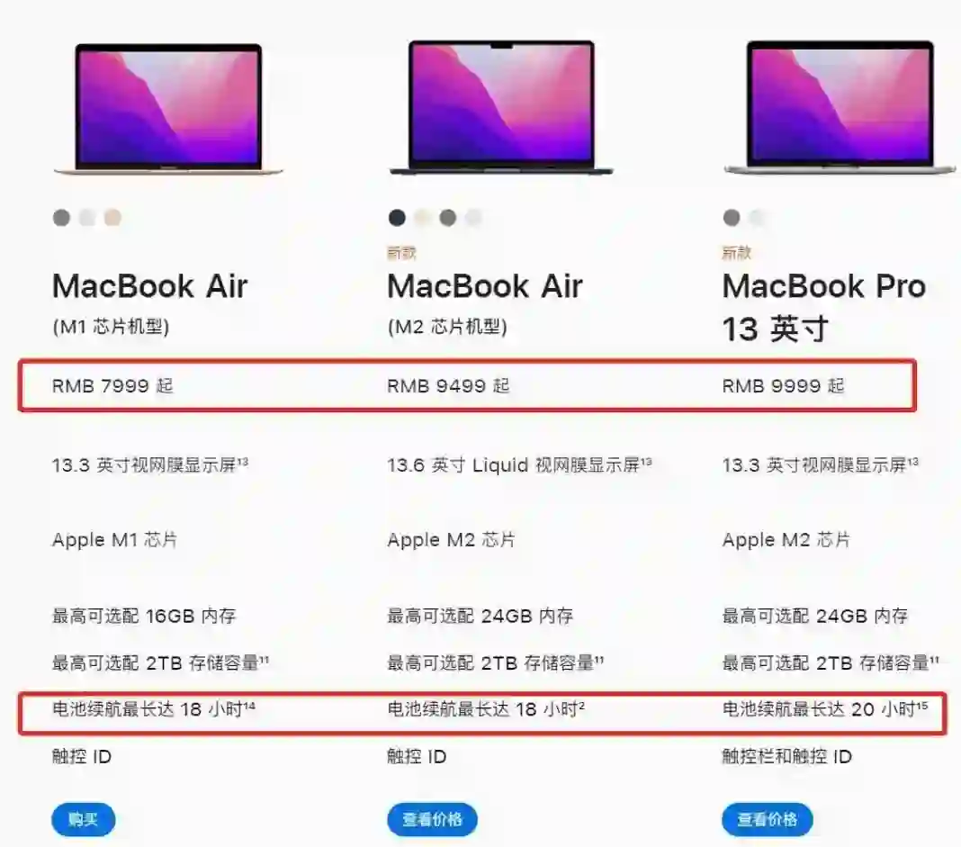 目前的官网价格:国行 M2 版 MacBook Air 起售价 9499 元(8 核 GPU,8G+256G),13 英寸 MacBook Pro 起售价则是 9999 元(8G+256G)。